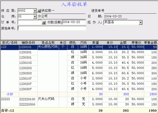 ·商品管理:商品采用含颜色 、尺码的二维表管理,每个商品可以根据实际情况自行设计,选择已定义好的颜色尺码,从而任意组合成商品特性的二维表;支持条形码管理;可分别对商品库存设置库存商品的上下限,对库存进行良好的监控;可预设多种进销价格,系统自动记录最高、最低、最近价格。